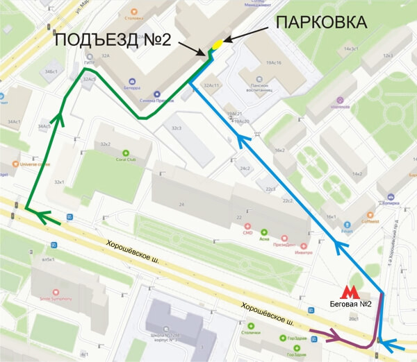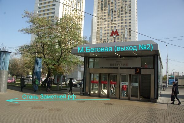 От метро «Беговая» (или на автомобиле с 3-го транспортного кольца) пройти или проехать предельно просто, тем не менее, для удобства предлагаем несколько фотографий: Метро «Беговая», выход на улицу из 1-го вагона из центра (направо):